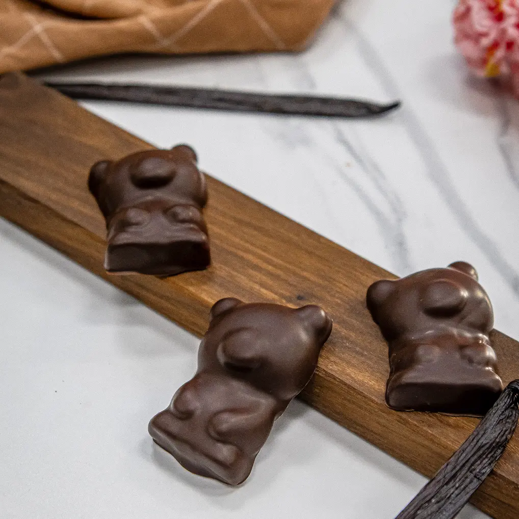 Chocolat noir 70% (Pâte de cacao, sucre, beurre de cacao, émulsifiant Lécithine de soja, arome naturel de vanille), Miel, Sucre, Gélatine de Boeuf, Vanille de Madagascar
